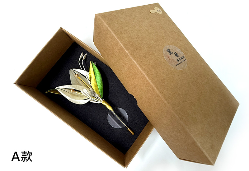尺寸:髮釵: 20.5*8*5 cm,領針: 13.5*7*2.5 cm 材質:6X15X3cm 繡線、金屬、實木釵