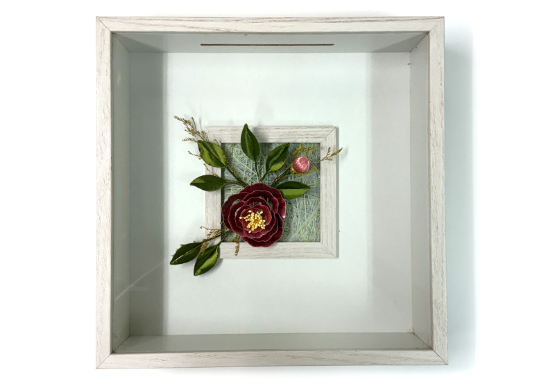 芙蓉盛放,寓意「福榮」,承載著人們對幸福與榮耀的祝願。此作以纏花工藝纖絲纏繞,層疊而成的花瓣如水波般柔潤,映照著時光裡不滅的情思。深紅芙蓉在木質框景中綻放,如同台灣傳統宅院裡的一抹暖色,將福澤與喜悅綻放於日常。命名「絲念」,既是工藝中絲線纏結的心意,也是寄託人們對福祿安康、家運昌榮的綿長思願。