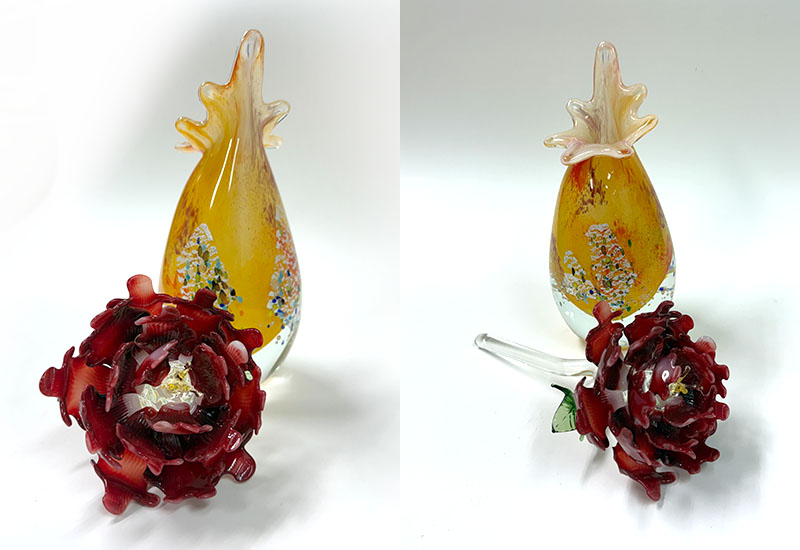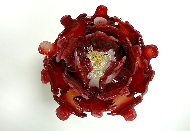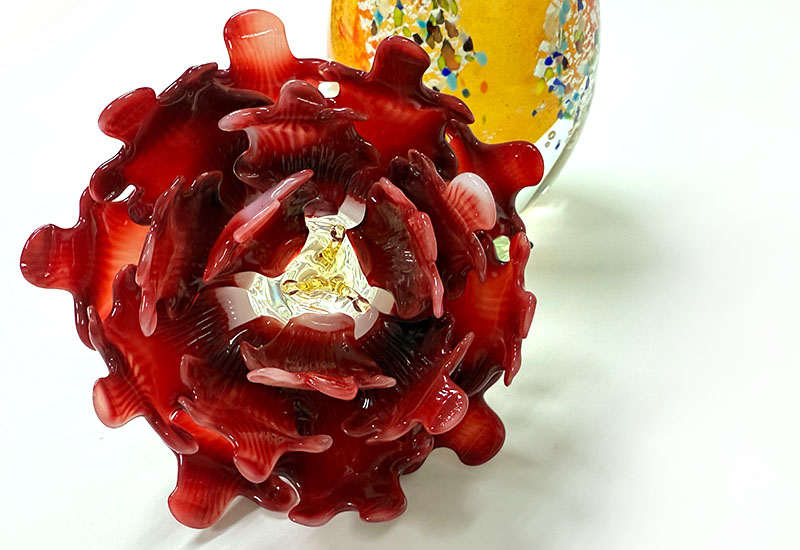 於1300度玻璃漿結合不同係數玻璃材質配色透過吹製及手工拉製塑型出各種不同風格的藝術品。