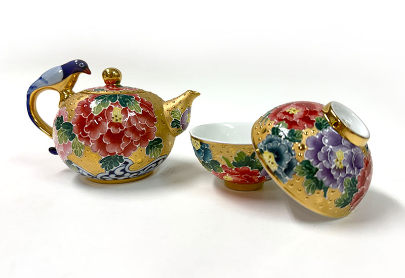 茶壺化作翩翩藍鵲,翅羽間映著盛開牡丹,生氣盎然;對杯以牡丹、金幣點綴彩雲,寓意富貴榮華、財運如雲般滾滾而來